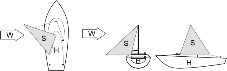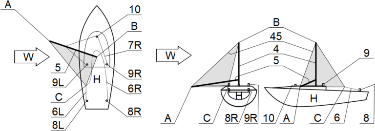 • a mast (4) and boom (5), installed on the ship’s hull (H)